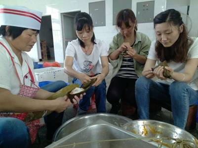 公司党支部与食堂工作人员提前准备好各种食材、馅料和工具,在食堂里一字排开。首先由食堂员工教大家包台山粽,讲台山端午的习俗。食堂阿姨向“学员”们介绍台山粽的选料、包法、蒸煮,讲解台南粽、台北粽与海边粽在食材、馅料和大小以及包法上的不同,分享端午节的赛龙舟、拔河扔粽子等习俗,并手把手教“学员”们包台山粽。“学员”们听得入神,学得认真,包得起劲,纷纷将自己家乡过端午的趣闻趣事拿出来跟大家分享,并各自当起师傅,教大家包自己家乡的粽子,展示了各自家乡三角形、方形、长条形等多种粽子的包法。在场的职工被各地的风俗和奇怪的粽型逗得开心大笑,整个食堂变成一个欢乐的海洋。不少平时坐在办公室的“九零”后也加入了包粽大军,发挥“九零”后大胆创新精神,天马行空,将各种食材和馅料混搭,包出各种“奇味”的粽子。