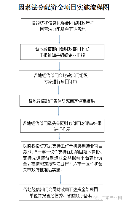第十六条 因素法分配资金,由珠江西岸“六市一区”和韶关市按照省财政扶持政策,下发申报通知,组织申报、审核、评审和实施,并将具体项目安排计划报省经济和信息化委、省财政厅备案。