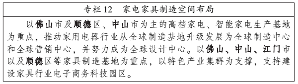 12.家电及家具制造。以智能、节能型家电为主攻方向,推进家电芯片、高效环保变频压缩机等关键零部件的研发创新,发展智能家电节能技术、工业设计、在线监测等,发展智能家电、智能卫浴、智能家居等智能消费品,发展绿色健康的空气净化器、净水器、节能节水器具、绿色家电等绿色制造消费品。以环保节材型家具、新中式家具、全屋定制家具、多功能家具、保健养老家具等环保多功能家具为发展方向,推广家具环保涂装工艺技术设备、柔性自动化生产线等先进家具制造技术和设备。