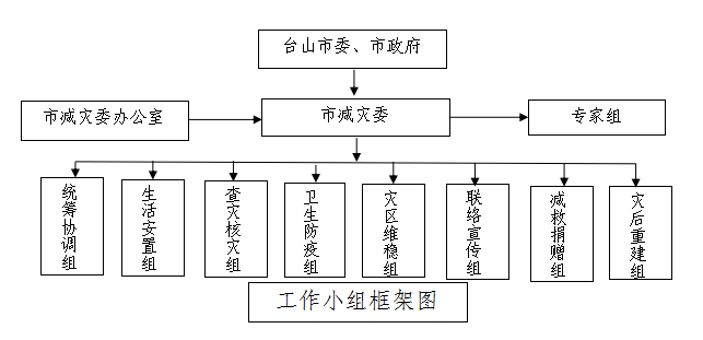 2.1.1 根据《广东省自然灾害救助应急预案》《台山市突发公共事件总体应急预案》的要求,本市突发事件应急管理工作由市委、市政府统一领导;市减灾委为全市自然灾害救助应急综合协调机构,统一领导、指挥、协调全市自然灾害应急救助工作,指导全市开展减灾和灾害救助工作。