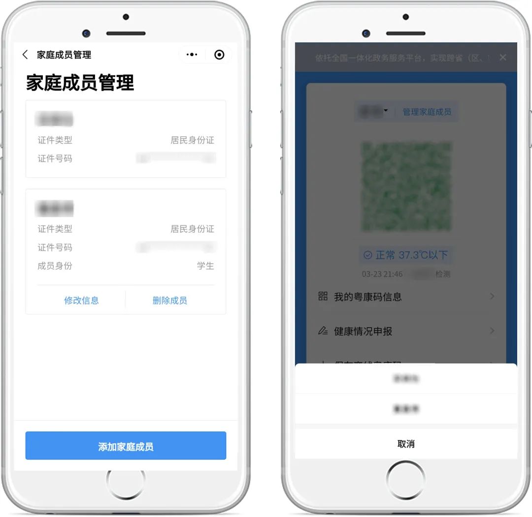 打开粤康码,点击“添加家庭成员”或“管理家庭成员”,按指引进行操作。(添加时通过人脸识别认证身份)