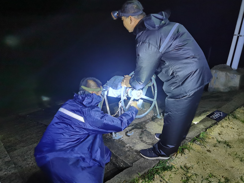 夜间,山塘水库值守人员对接近汛限水位的单位开闸放水,确保山塘水库运行安全。