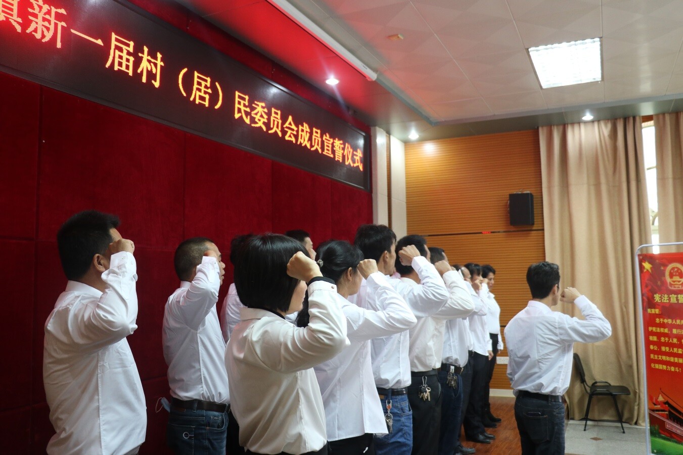 述职会后,举行了2021年新当选村(居)民委员会成员就职宣誓仪式,在与会人员的见证下,19个村(居)民委员会主任高举右手,紧握拳头,面对宪法,庄严宣誓。