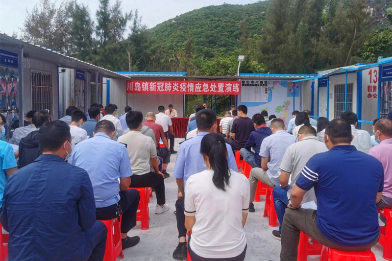场景演练模拟我镇出现本土阳性个案后有序开展应急处置工作。镇新冠肺炎防控指挥办立即启动先行处置机制,川岛镇疫情防控“战时”指挥体系15个组启动响应,按照同时管控“四点”和迅速落实“四定”的原则,开展工作。