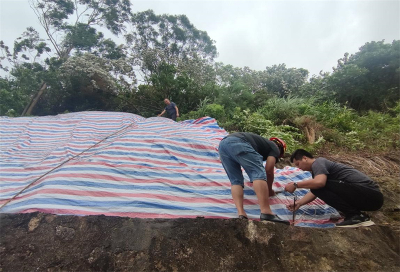驻点及村委会干部帮助山边居住的群众加固防风屏障