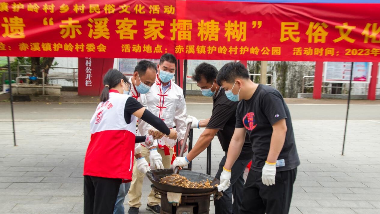 4月15日,赤溪镇护岭村举办台山非遗“赤溪客家擂糖糊”乡村民俗文化活动,邀请客家擂糖糊非遗传承人刘耿维师傅现场制作擂糖糊。