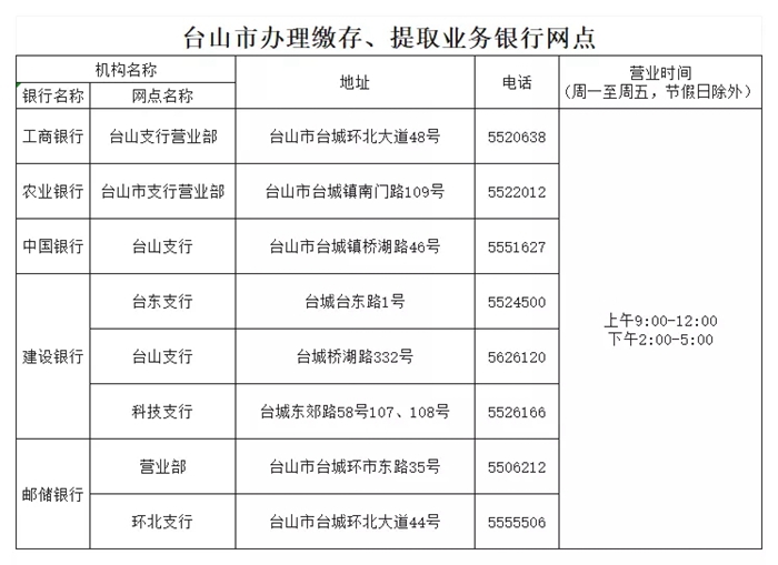 截至目前,江门办理住房公积金归集、提取业务的受理银行网点已增加至91个。其中,台山新增一个。目前,台山共有工商银行、邮政储蓄银行、农业银行、中国银行、建设银行共8个网点可以办理公积金缴存、提取业务。