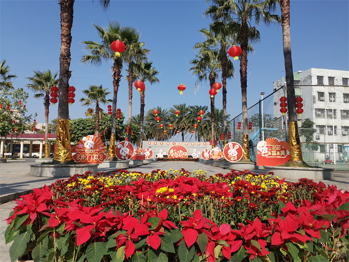 为营造欢乐、喜庆、祥和的节日氛围,展现红火热闹的中国年味,冲蒌镇推进镇区美化亮化工作,在重要干道沿线、三星公园、高速出入口进行节日装饰和灯饰亮化,布置灯笼串、兔年装饰、喷绘、鲜花绿植等,提升镇容亮化水平。