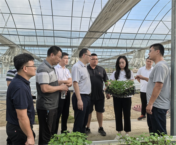 随后,共建队伍来到冲蒌镇南瓜产业基地——台山市侨农汇农业发展有限公司。一行人认真参观了解南瓜育苗棚、南瓜种植田情况,深入听取企业负责人李灿章介绍本土农业企业发展历程、南瓜深加工食品厂建设规划。省科学院南繁种业研究所科技特派员沈大春就南瓜育苗基质复壮循环利用技术、植物基质营养规律定向匹配技术、复合微生物种植技术应用研究等进行了重点交流。通过党建共建成功推动台山市侨农汇农业发展有限公司与省科学院南繁种业研究所的紧密合作,致力解决南瓜土壤和营养需求精准施肥技术难题,加快农业科技创新成果推广应用,以新技术的示范带动增加农民收入,开辟科技强农“新赛道”。育苗技术研究成功后,预计最快两年后种植成本可下降100元/亩,年新增产值超30万元。