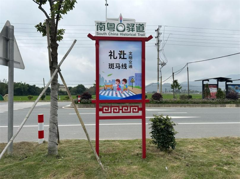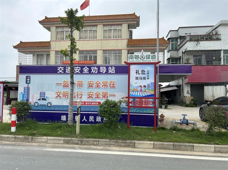 安全提示升级,更醒目。端芬镇设置交通安全劝导站,结合南粤古驿道特色设计交通劝导标志。“一盔一带,安全常在”,随处可见的交通规则提醒标志、交通警示灯、路口指示,都得益于此次的交通基础设施配套“提档升级”工程。
