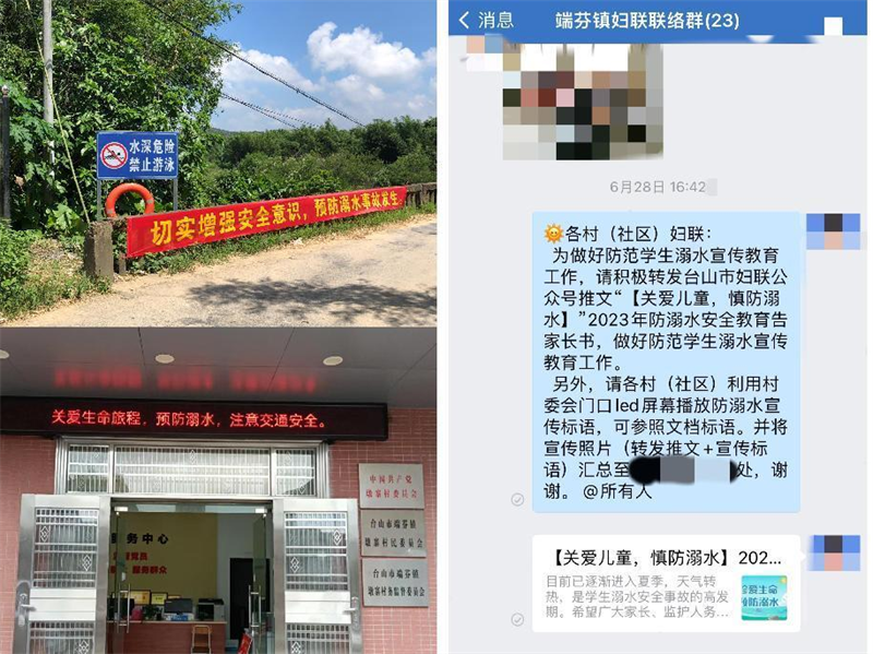 聚焦安全守护,开展防溺水安全宣传工作。镇村(社区)妇联利用工作群、悬挂横幅、村广播、电子屏幕轮播等形式广泛宣传预防溺水知识,切实发挥执委力量,组织各村执委进网格,进村入户向家长和学生发放防溺水宣传单,帮助家长和学生掌握防溺水安全知识和自救举措,提高自救能力。为了进一步以实际行动助推防范溺水宣传工作,我镇妇联在端芬镇(端芬圩社区)妇女儿童之家开展防溺水知识宣传活动,志愿者通过发放防溺水宣传单,向家长孩子们讲解常见的溺水原因、危害、前兆、自救互救方法等知识,做到安全知识牢记于心,筑牢防溺水生命安全防线,为广大群众和青少年儿童生命安全护航。