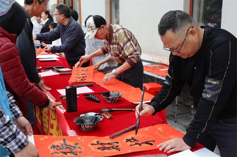 活动现场,墨香飘溢,气氛热烈,铺纸、蘸墨、起笔……书法爱好者提笔挥毫,一个个苍劲有力的大字跃然纸上,一幅幅充满新春气息的春联展现在眼前。往来群众纷纷驻足观赏,争相挑选自己心仪的对联,为家中增添一份独特的年味。此外,志愿者还准备了红包袋,与春联一并派送到群众手中,送上最美的新春祝福。拿到春联和红包袋的居民都喜笑颜开,阮伯说:“准备过年了,春联和红包袋正是必需品,非常实用而且也饱含心意,我非常喜欢这次的活动。”