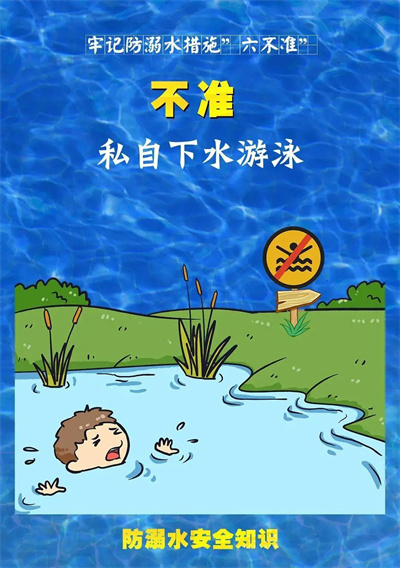 安全教育关乎孩子的生命安全。请各家长朋友们加强对孩子预防溺水的安全教育,提高孩子的自我保护意识,使孩子严格遵守防溺水“六不”教育,即:不私自下水游泳;不擅自与他人结伴游泳;不在无家长或老师带领的情况下下水游泳;不到无安全设施、无救援人员、无安全保障的水域游泳;不到不熟悉的水域游泳;不熟悉水性的未成年人不擅自下水施救。