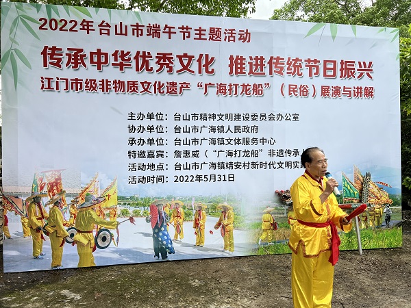 近年来,随着人民生活水平的不断提高、节日活动的日渐丰富,土生土长的广海年轻一辈对“打龙船”这项传承百年的文化瑰宝了解日趋减少。为了深入推进非物质文化遗产保护,传承中华民族生生不息的传统文化,5月31日,在端午节到来之际,台山市精神文明建设委员会办公室、台山市广海镇人民政府联合台山市广海镇文体服务中心在广海镇靖安村新时代文明实践广场开展2022年台山市端午节主题活动——“传承中华优秀文化 推进传统节日振兴”江门市级非物质文化遗产“广海打龙船”(民俗)展演与讲解活动,活动现场特别邀请了广海“打龙船”传承人詹惠威进行宣讲。此次活动包括党员群众、广海中心小学学生超50余人参与。