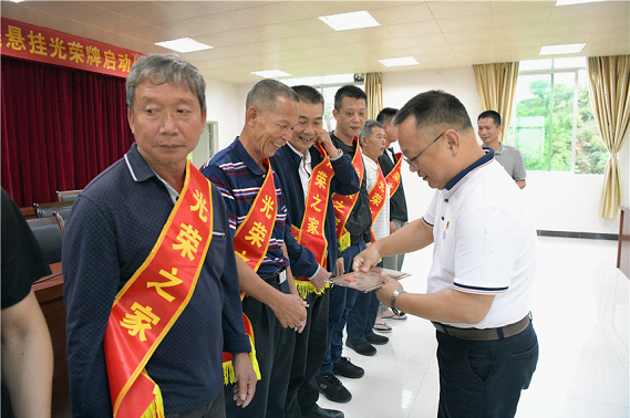 伍嘉峰、刘志东、镇委委员罗超仁为烈属、军属和退役军人代表送上“光荣之家”牌匾。