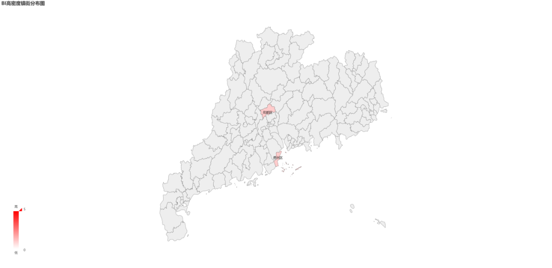 图1 广东省2023年10月上半月幼虫密度BI高密度监测点所在镇街地图,其中高密度是指BI>20,各地区红色的深浅程度表示该区域内高密度监测点的数量,颜色越深表示高密度监测点越多,伊蚊幼虫密度越大,登革热流行风险越高。