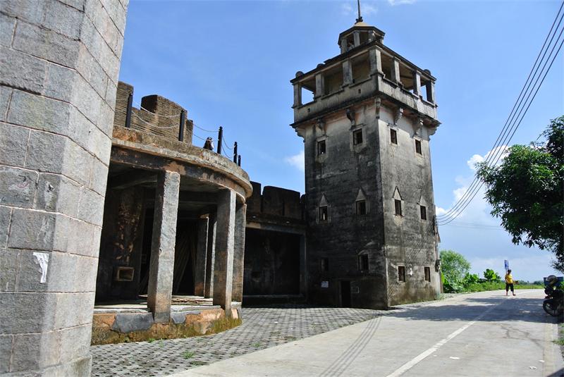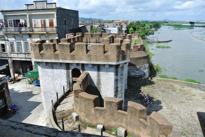 冈宁圩形成于20世纪20年代,全盛于30年代。为台山县新昌区独冈乡(今冈宁村域时属新昌区独冈乡)黄姓所创建。“冈宁”称谓始于1923年始设圩时,寓意“地属独冈乡,治属新宁县”(时新宁县已改称台山县,但民间仍沿称新宁)。建圩初期以竹、木、葵搭蓬为铺,1927年因中心店铺“杏记木店”起火而全圩尽毁,次年由冈宁水口村吕宋华侨倡议重建冈宁圩,聘请当时广州著名建筑师黄大韶(冈宁英管村人)主持建圩工程,于1930年竣工。全圩共建成102间连体二层楼商铺,建筑特色中西合璧。并建置三个临江码头和一座碉楼。由此,冈宁圩商贸活动日渐繁荣,成为当时台山北部地区重点水上运输装卸地和商品集散地之一,吸引了台山开平恩平等地商人前来经商。抗日战争后,作为商贸集圩,冈宁圩走向衰落。至80年代改革开放,冈宁圩以其便捷的水上交通条件和充裕厂房(商铺)条件,以民营企业集聚发展方式再度勃兴。至90年代初全盛时期,全圩有五金、塑料、造纸、纸品加工等20多家工业企业。近年因陆路交通发达,水上交通式微,冈宁圩企业逐步向台城、三埠、水步圩等城镇迁移发展,冈宁圩复归沉寂。但其独具特色的建筑风格及其完好无损的原始状貌,却日显其历史文化价值,引起文化界的关注。2009年,电影《让子弹飞》剧组选中冈宁圩作拍摄外景点,投资300多万元增设门楼等景观,并在此完成一些重要场景拍摄。继而大型电视剧《将军》剧组于20101月选点冈宁圩作外景配景拍摄。之后,冈宁圩凭着其独特、淳朴的建筑风格获得电影《一代宗师》、电视剧《决战1929》的剧组选为外景拍摄地之一。