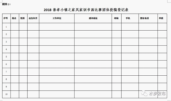 3.其他要求:参赛作品必须是2018年的原创作品,已在县级以上获奖与展出的作品原则上不参加,版权自负。参赛者需填写《附件1:善孝小镇之家风家训书画比赛投稿登记表》,学校单位收齐参赛作品,填写《附件2:善孝小镇之家风家训书画比赛团体投稿登记表》。