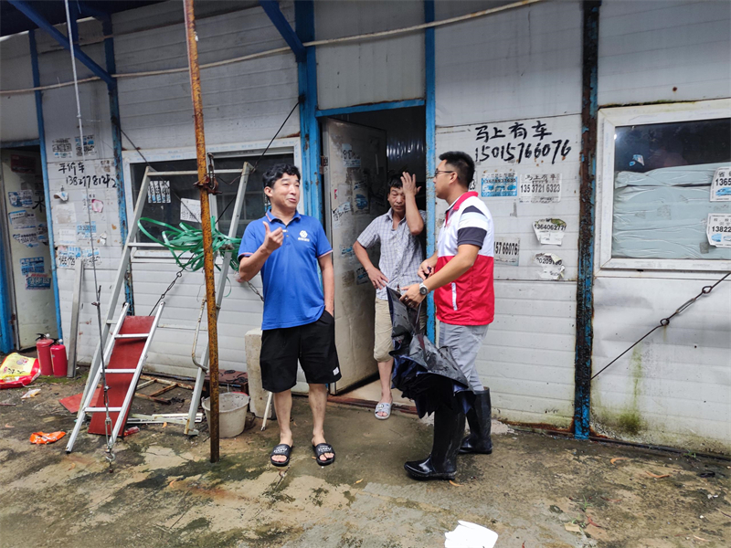 “秒叔,台风即将要来了,你们这个简易棚打风下雨的时候很危险的,赶紧收拾好东西跟着我们干部一起转移到安全的地方。”在种植户耕秒家中,那金驻村第一书记许家康与那金网格员、“双百”社工正协助其与家人前往德兴村祠堂进行紧急避难。许家康刚上岗报到,便立即投身到那金村台风”泰利“防御工作中,他与那金驻点干部、村委会干部重点排查养殖场、临时建筑、水库林地等重点区域,提醒户外作业人员及时转移到安全地方,确保自身安全。