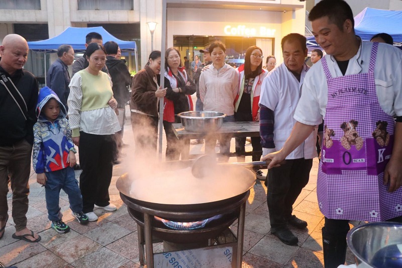 傍晚,三合美食夜市隆重开张。美食还未完全出锅时便有大批市民已在自觉排队等候。“饭闻着香,吃着也香。”“这个鸡酒的味道非常冲,十分香浓,我现在吃到有些上头又回味无穷。”“汤圆是我小时候的味道,给厨师们点赞!”……来往的群众络绎不绝,除了热腾腾的免费食物,还有海鲜叻沙、茅台酱香双皮奶等特色美食,以及咖啡、烧烤、啤酒恭候他们光临。不少食客拖家带口到此满足口腹之欲。