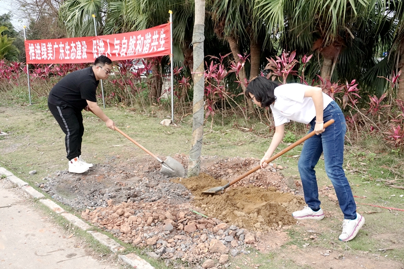 在植树活动现场,大家分工协作,积极投身于植树行动中。一株新苗,一锹厚土,一瓢清水,你扶苗我培土,每一组配合默契,现场气氛热烈,一片热火朝天的劳动景象。经过数小时的努力,一排排新栽的树苗在和煦春风中昂然挺立,为公园增添了浓浓绿意,焕发出勃勃生机。