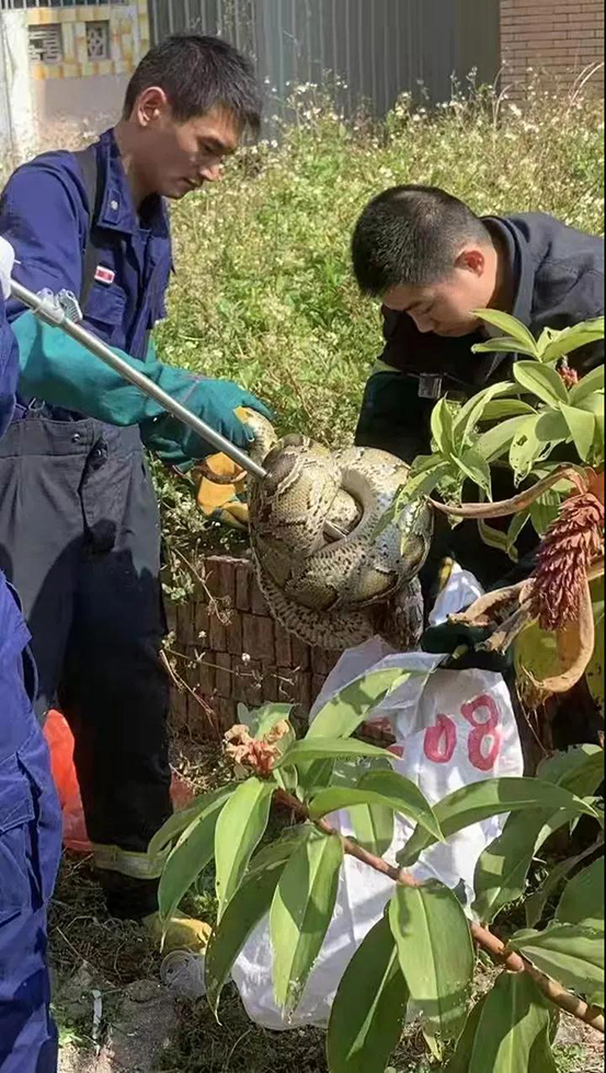 12月8日中午,汶村镇接到群众报警,该群众称在汶村镇新屋地村发现一条大蟒蛇。消防员到场后,迅速做好防护措施,利用捕蛇器将蛇驱赶至空旷处后进行了抓获,最后在安全地方进行了放生。