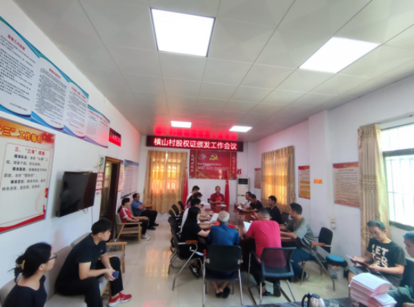 2023年月9月21日上午,汶村镇横山村委会举行股权证颁证仪式,为股民代表颁发股权证,激发辖区群众对汶村镇横山村“三变”改革工作的期盼和热情,大幅度提升村干部的工作积极性,有力推动横山村“三变”改革的工作向纵深发展。