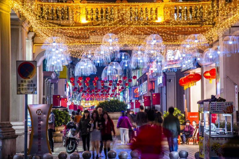 夜幕降临,五彩缤纷的灯饰点缀着繁华热闹的街道,吸引众多市民游玩观赏,拍照留念。为增添市区公园广场节日气氛,在石化文化广场、金星湖湿地公园、站前广场、高速路口收费站前交通岛分别布设迎春接福大型花灯四座。今年,最大的亮点是在传统花灯的基础上,融合现代的科技灯饰,在台西路步行街、西濠路及商业城等区域打造的特色灯饰景观。将悬挂满天星灯串及五角星、许愿灯、星球等造型灯饰,布置的投影灯会播放台山特色景观,组成一个新颖的有看点的灯景。缤纷闪耀的各式灯饰和亮化的各栋楼宇将把城区扮靓成灯光的海洋,展现出一派浓浓的春节气息,大家可以共同期待!