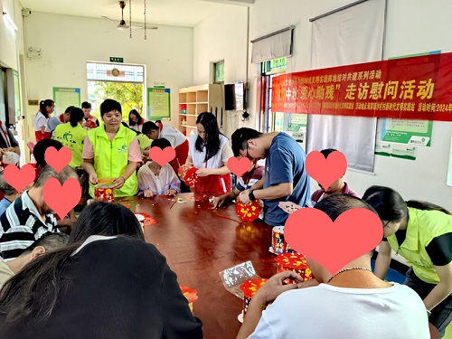 慰问组一行先行到海宴镇康园,与康园老师和20名学员交流互动,详细了解学员们的身体状况和生活情况、康园的运营情况等,并与学员们一起制作中秋灯笼,为他们送上节日慰问品和祝福。学员们对慰问组一行的到来感到十分开心,以舞蹈和合唱的形式展示学习成果,并以此感谢党和政府、社会各界对他们的关心和关怀。