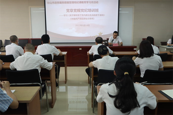 为深入贯彻落实全市纪律教育学习月活动要求,进一步强化党员干部党章党规党纪意识,8月14日,市政数局举办党章党规党纪培训班,局及两个中心全体党员干部参加。